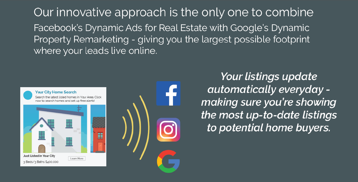 Our innovative approach is the only one to combine Facebook's Dynamic Ads for Real Estate with Google's Dynamic Property Remarketing - giving you the largest possible reach across Google, Facebook, and Instagram.